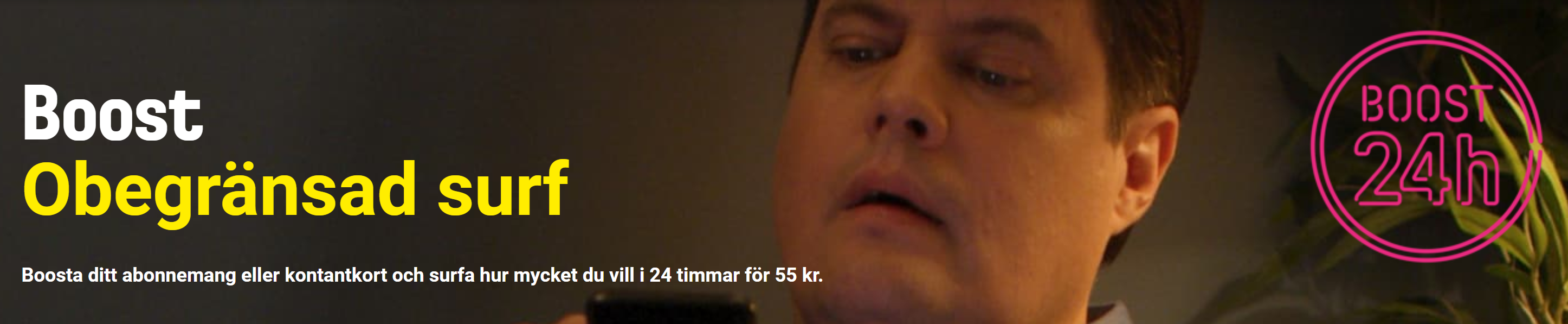 Du kan anända Comviq boost för både abonnemang och kontantkort och när du har beställt boosten har du obegränsad surf i 24h och det påverkar inta din underliggande befintliga surf.